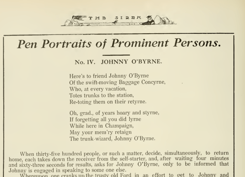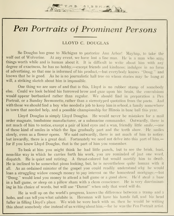Besides contributing a weekly column in the University of Illinois’ student newspaper, the Daily Illini, Lloyd Douglas also wrote anonymous articles in The Siren, a student-run magazine. During the 1914-1915 school year, he wrote a series of tributes to the university’s top administrators, describing their distinctive characteristics (hence the name “Pen Portraits”). It was just like Douglas to give the series a memorable title through the use of alliteration: “Pen Portraits of Prominent People.”