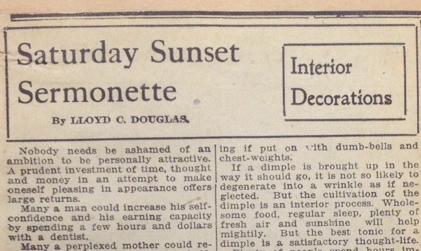 During the last two school years Lloyd Douglas was at the University of Illinois, he wrote a weekly column in the Daily Illini, the student newspaper. In 1915, when he accepted a call as Senior Minister at the First Congregational Church of Ann Arbor, he widened the circle. Since he was no longer strictly involved in campus ministry, he knew he also had a responsibility to reach out to the larger community. One way he did that was to write a weekly column in the Ann Arbor Times-News. The column was called “The Saturday Sunset Sermonette,” and it began in September of 1915. Despite the word “sermonette,” the topics were quite down-to-earth. Here are some examples:
