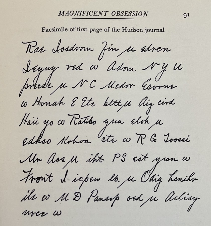 One interesting feature of the novel Magnificent Obsession is the fact that Doctor Hudson’s journal was written in code, to prevent people from discovering his secret too easily. When Nancy Ashford presents the diary to Bobby Merrick, he is determined to crack the code. Here is the first page of it: