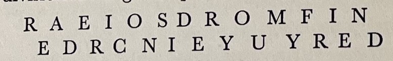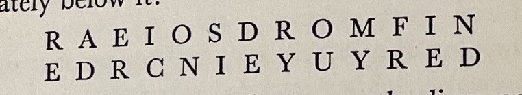 Although I still wouldn’t have seen it, Merrick realizes that the key is to take the first letter from the top line, the second from the bottom line, the third from the top, and so on. He comes up with this: